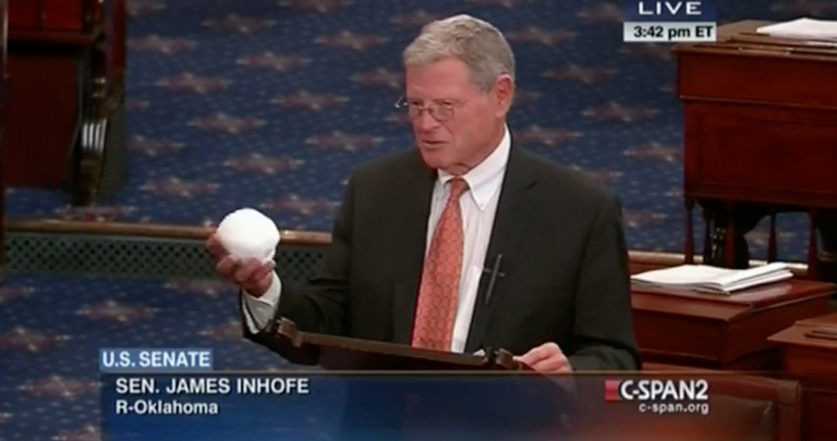 On Thursday, Senator Jim Inhofe (R-OK), who chairs the Environment and Public Works Committee, decided to spend some time (and whatever percentage of tax payer dollars funds his $174,000 salary) trying to disprove global warming by throwing a snowball to President Obama.